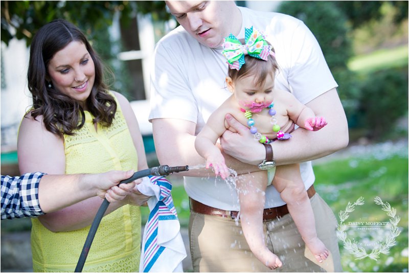 We worked with Sarah and Aaron during their engagement and wedding celebration and were thrilled when they contacted us to capture their sweet baby Olivia. Oh Olivia. This child will most likely break the internet one day with her cuteness. Those baby blue eyes (Sarah) and that mischievous grin (Aaron) had us laughing the entire session. Near the end of the evening we brought out her smash cake to let her fully celebrate her first birthday. She wanted the smash cake but wasn’t thrilled with the messiness of the frosting (see below) until Beau discovered a new game with silly sounds to keep her grinning. I have the best partner and husband ya’ll. Olivia was soon playing in the mess, eating her smash cake like a baby bird (see below), and even tolerated a good hose down with Aaron and Beau keeping her distracted. We love what a gorgeous and sweet child she is growing up to be.