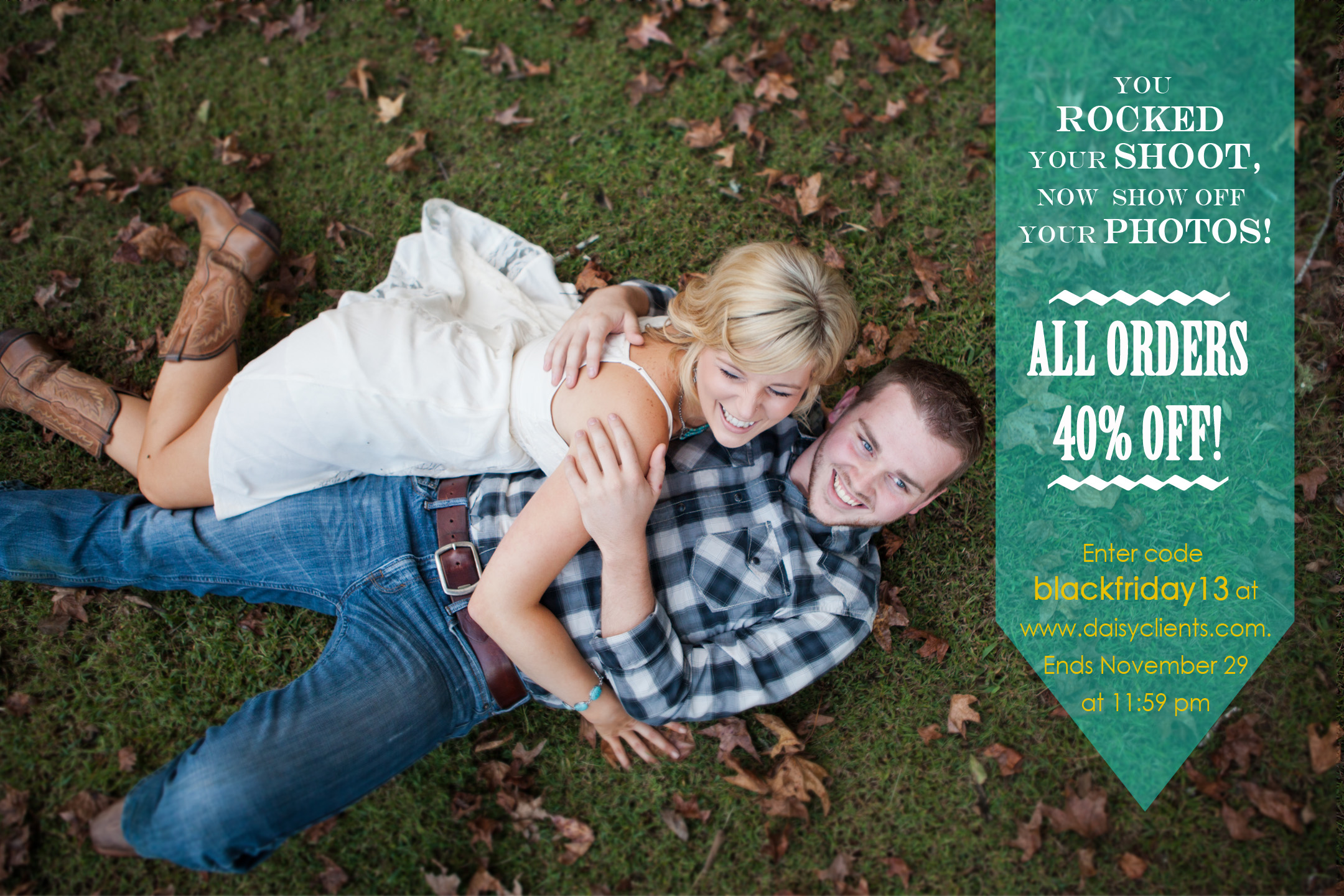 The sale of the year is here. Ready to finally take advantage of your wedding and family photos by having them professionally printed? Visit www.daisyclients.com and enter code BLACKFRIDAY13 at checkout for 40% off all prints, Christmas cards, canvas gallery wraps, albums, AND digital negatives. Also, re-releases are free for a limited time so contact us if your event has expired.