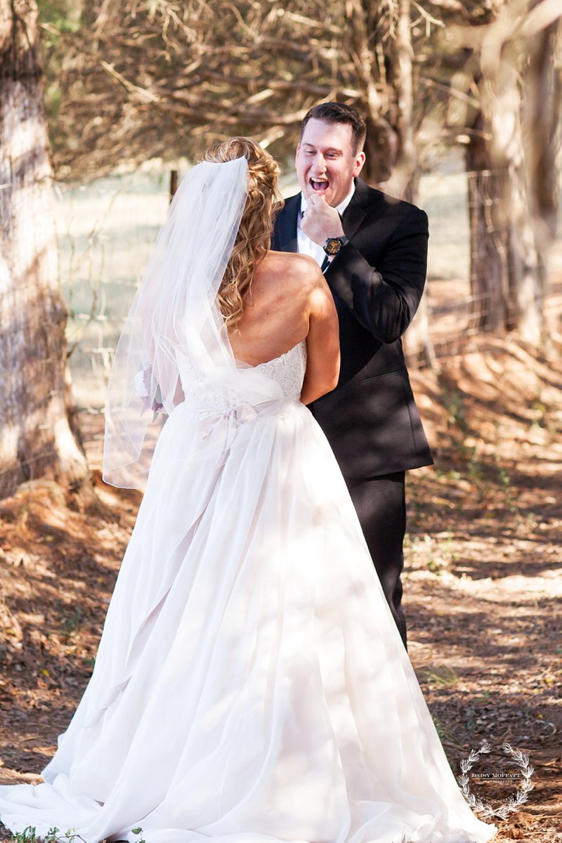 The sunlight shimmered through branches over the lane and he glanced towards Beau and I. “So when do I get to turn around?” he quietly asked with a twinkle in his eye. I smiled behind my camera and answered, “Hold tight, you’ll know”. She appeared from around the corner and a hush fell. Natalie was stunning and glowed in the afternoon light. Josh remained with his back towards her, waiting for the right moment. Then Natalie made her way down the lane and shyly tapped his shoulder, a smile playing on her lips.