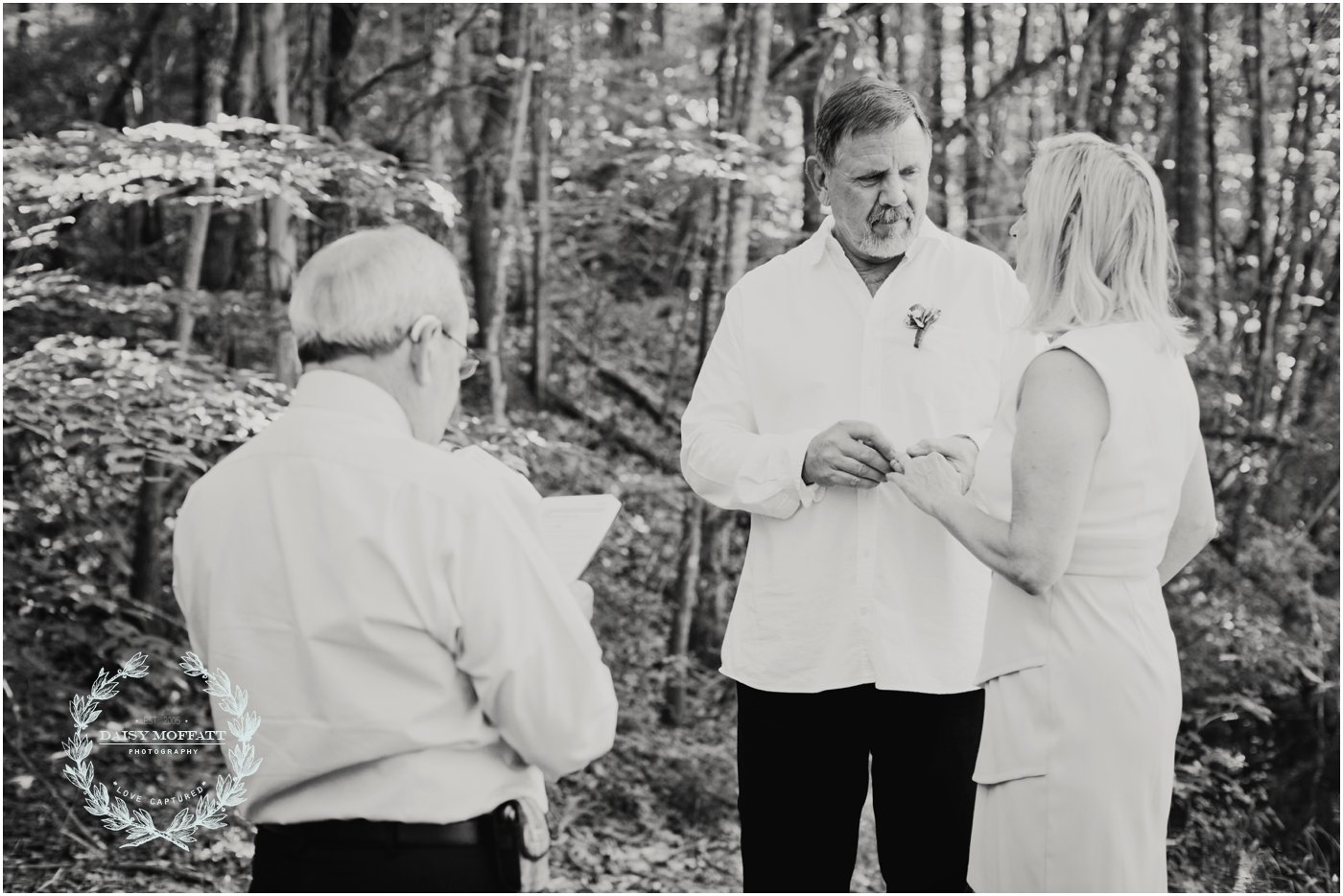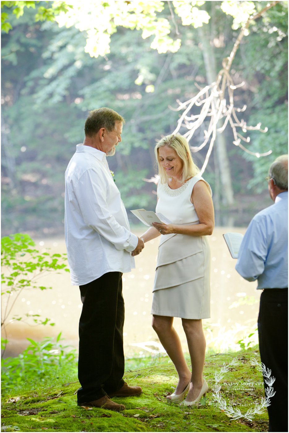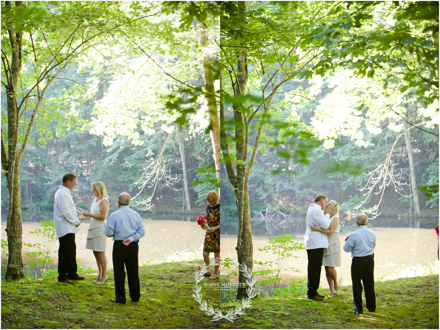 Around 5 pm that night, close friends Christal and Mike joined Cindy and Craig in the woods with Pastor Clyde Webb officiating. I couldn’t help but smile behind my camera as their emotion-filled vows filled the stillness of the forest. The sun sank behind the trees, the frogs and crickets voiced their approval, and Craig and Cindy committed their lives to one another on the mossy bank of a Tennessee pond.