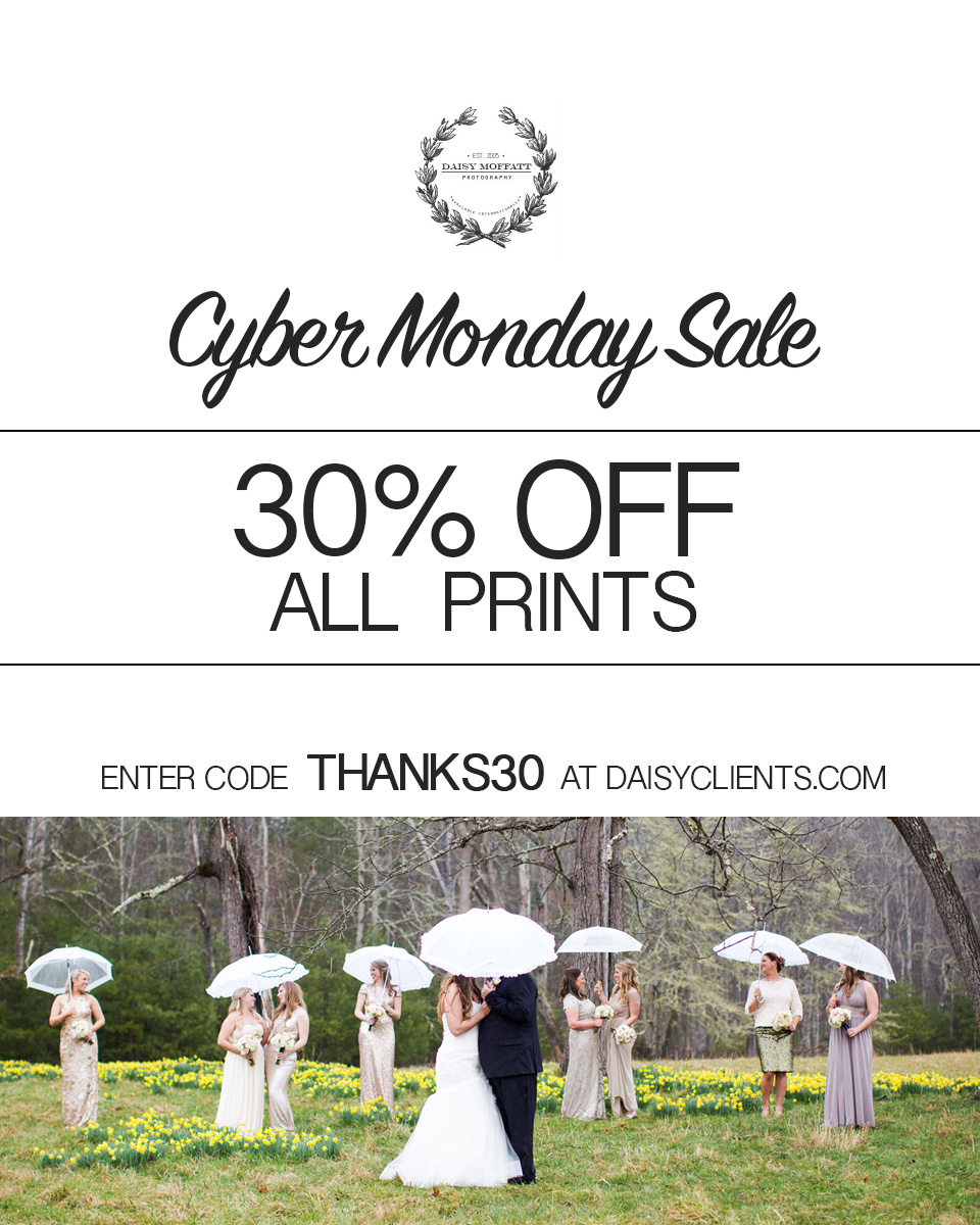 We are so passionate about printing your beautiful photos — your memories should be preserved and enjoyed! So this year for Cyber Monday we decided to offer 30% off ALL prints, large and small, at www.daisyclients.com. Finish up (or, if you’re like me, start) your holiday shopping by taking advantage of this exciting sale. Don’t delay, the code expires on Tuesday at midnight!