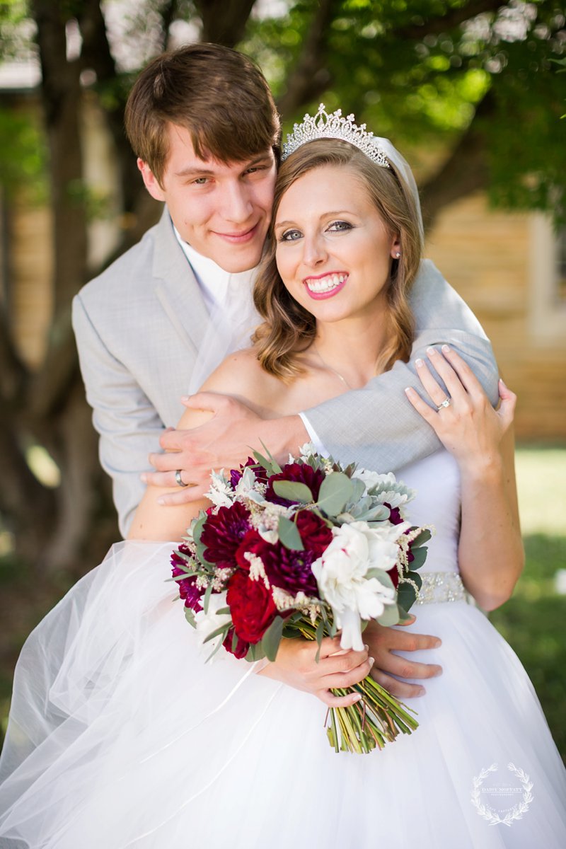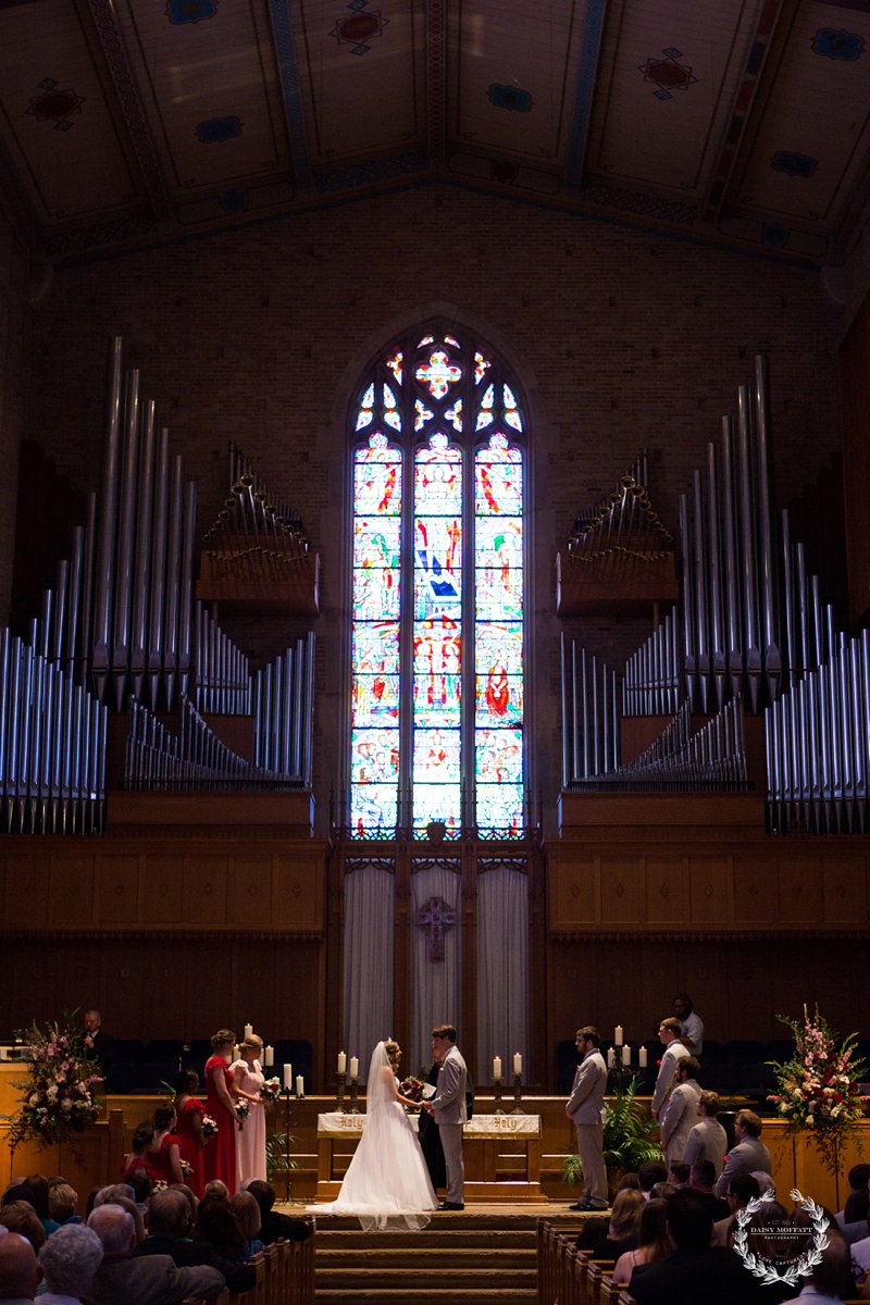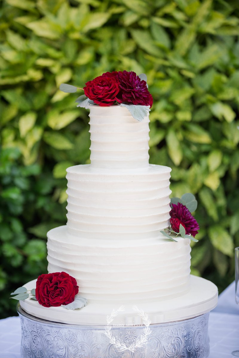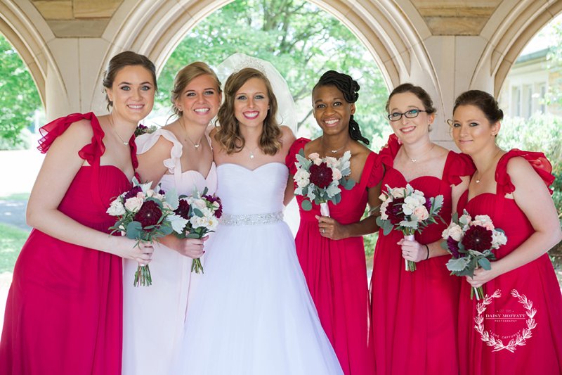 The day was glistening and warm, making their summer soiree shimmer. Jordan’s deep red marsala accents played perfectly with her flowing white ballgown (which she amazingly found in Florida mere days after saying yes to Drew’s proposal. Who gets that lucky?!!). 🙂 Their bridal party was so much fun, keeping Drew and Jordan laughing while they eagerly and nervously waited to meet one another at the altar. After their vows they celebrated in the courtyard of the church with their friends and family. Check out Cup a Dee Cake’s handy work–they are such a great team!
