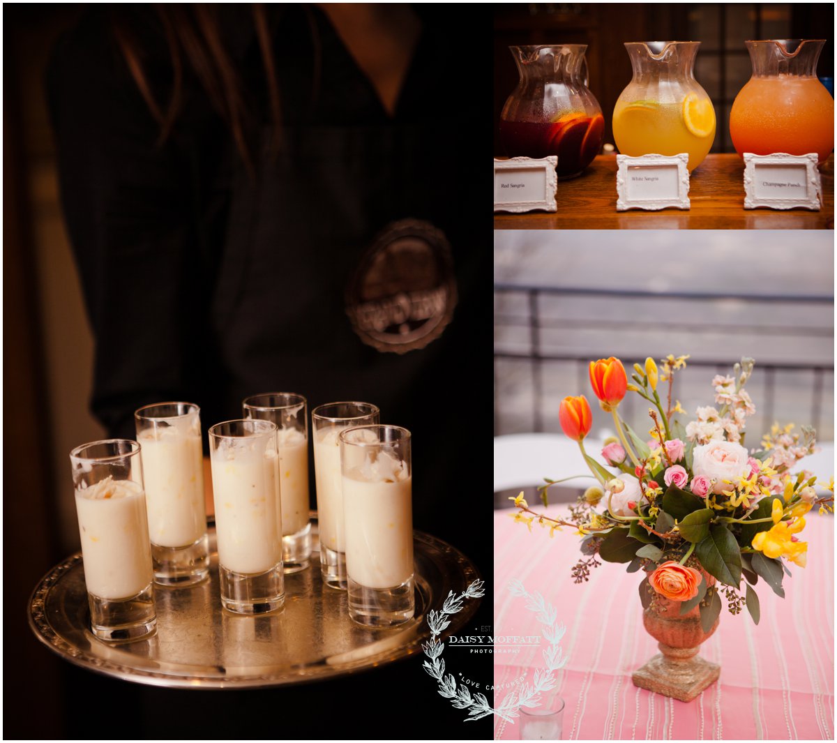 We were very honored when the lovely team at The Grandview asked us to be involved with this year’s tasting. They ALWAYS do an amazing job and this evening was no different. The food was fresh, beautifully displayed and full of flavor and depth. I especially enjoyed the mini burgers! They had the house set so that couples could envision their big day and meet the people who help to make it happen. B’s Sweets was on hand to answer questions about wedding cakes, along with the awesome Sound Force team and professional harpist Ansley Unsworth. Blissful Moments assisted couples and answered questions while they admired the work of May Flowers and The White Table. We were happy to show some of our work from previous weddings and meet so many sweet and happy couples!