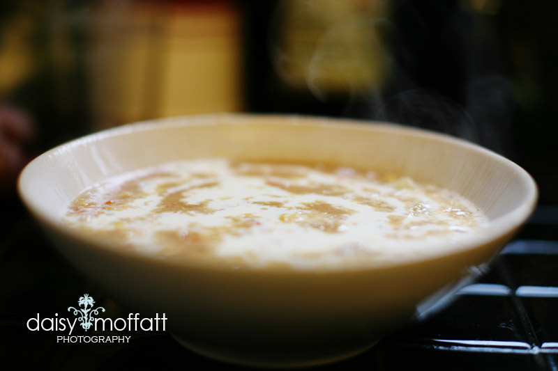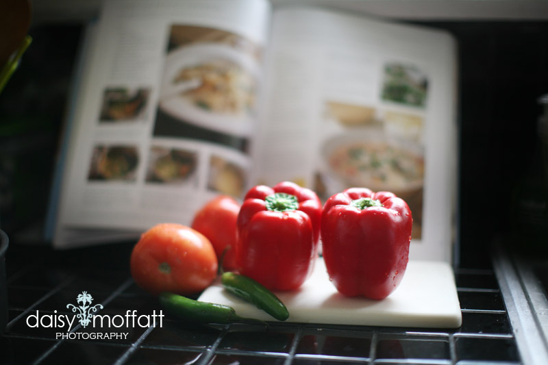 My hope is to just give you guys some snapshots of my kitchen adventures (and for our Facebook followers that may involve exploding pumpkin filling!). So without further adieu, here is my newest fave soup–Roasted Red Pepper and Corn Chowder (found in The New Soup Bible).