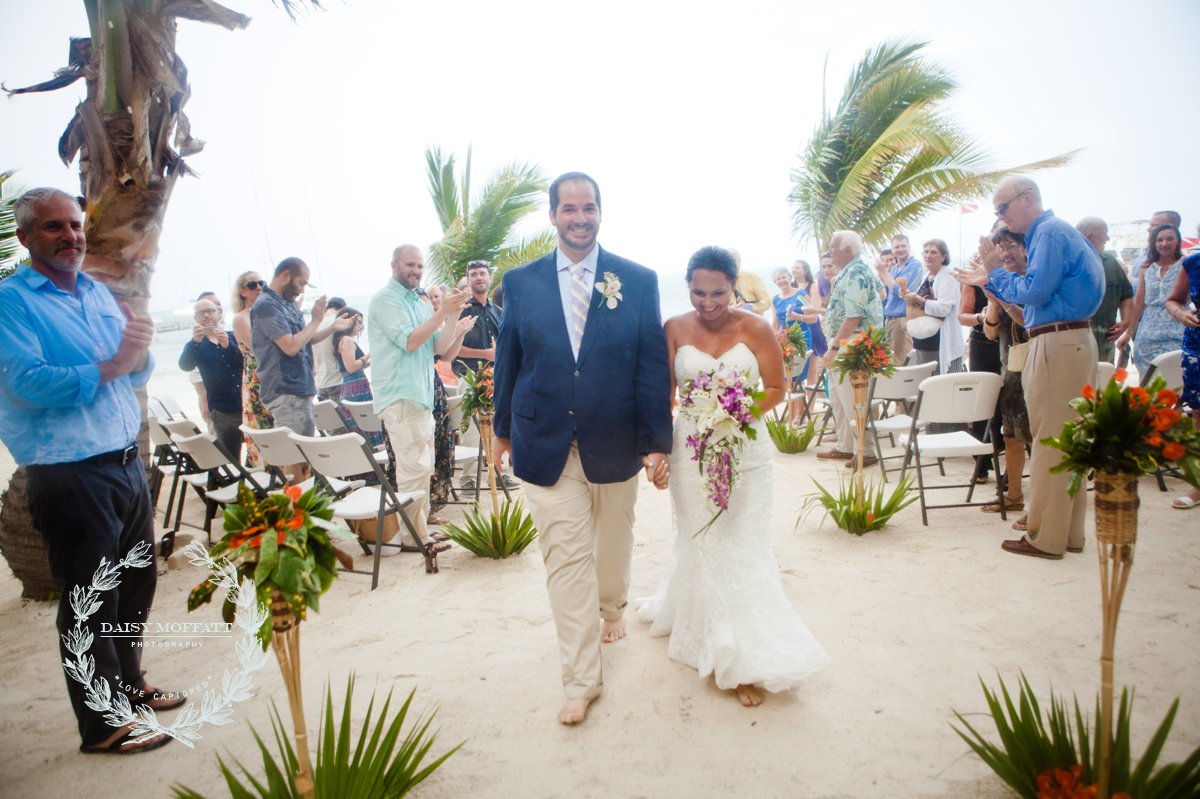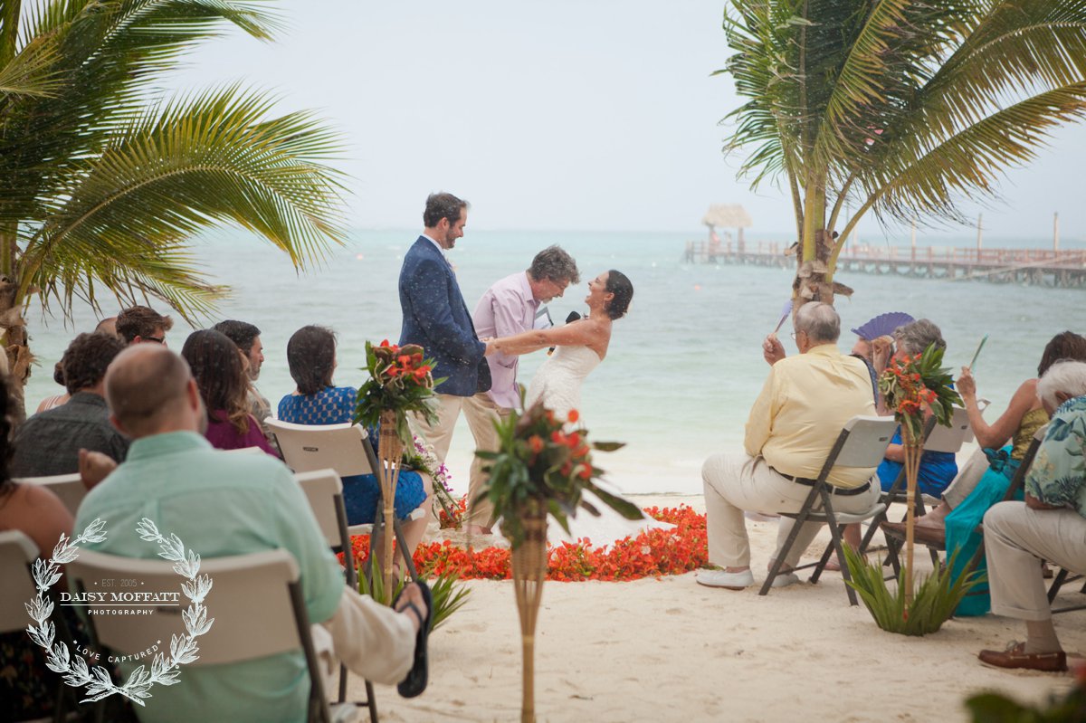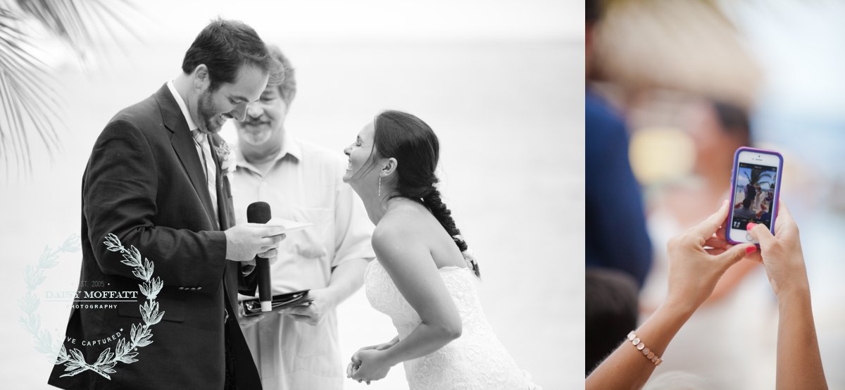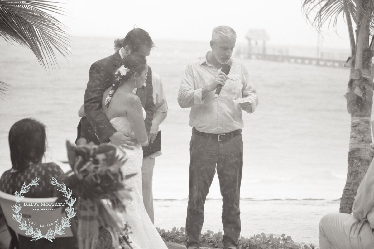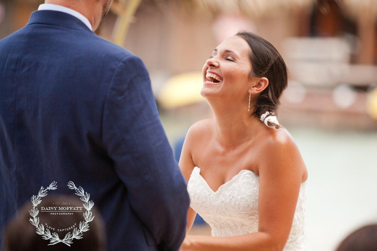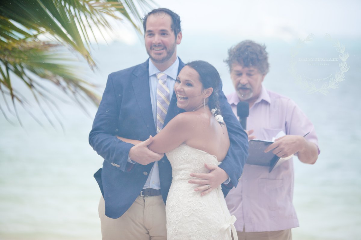 Their wedding day quickly arrived and the day was stunning! The sandy turquoise shoreline was meticulously prepared and their ceremony began as the sun set. The old belief that rain on a wedding day brings good luck means that Joel and Patterson will have the very best of luck! In true tropic fashion a rogue rainstorm snuck into the ceremony (seriously I was amazed at how fast it popped up!). As they stood at the altar Patterson simply looked around, threw her head back in laughter (see below) and they carried on–fully enjoying each moment. My heart swelled as I watched them literally and figuratively weather this little speed bump with such grace and joy. Everyone could see it was the happiest day for both and no one was too concerned about a little summer shower.
