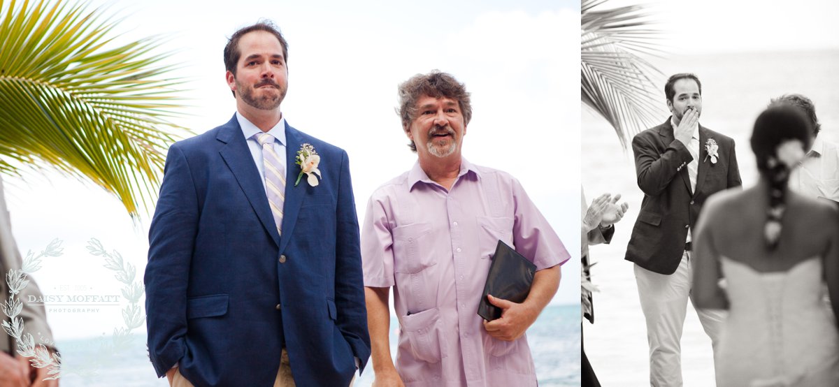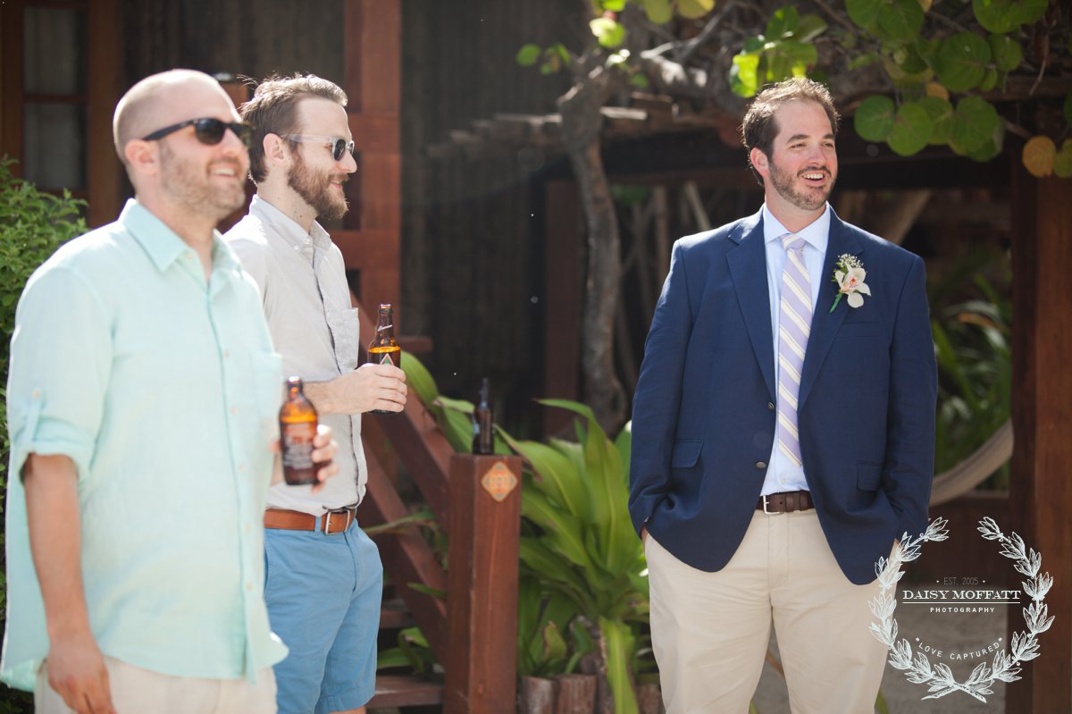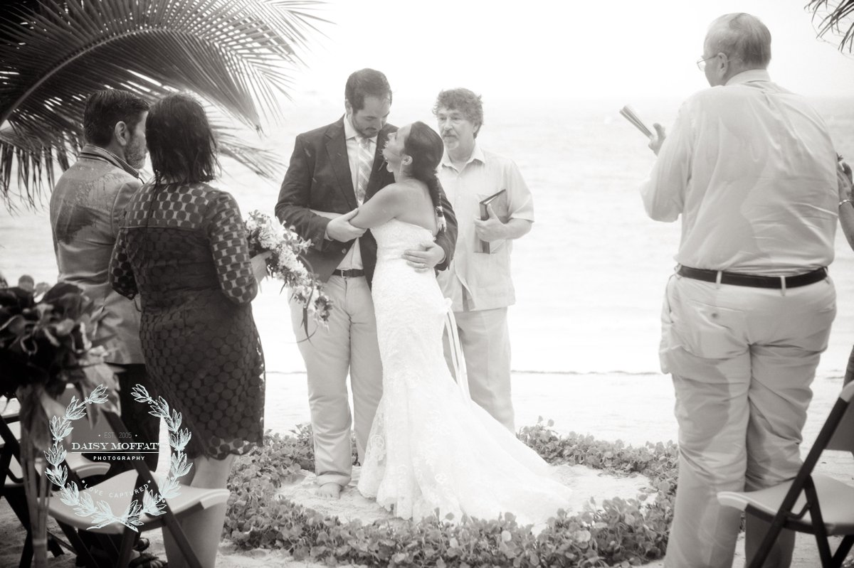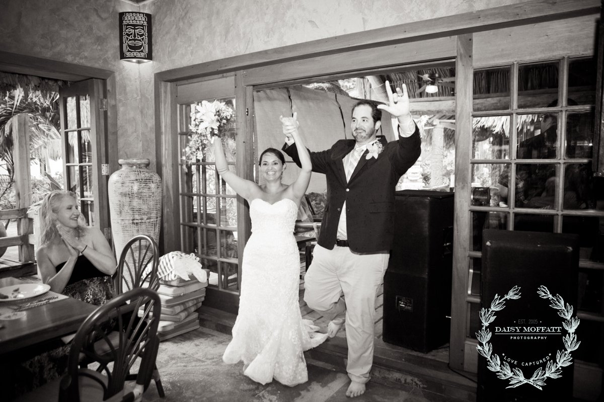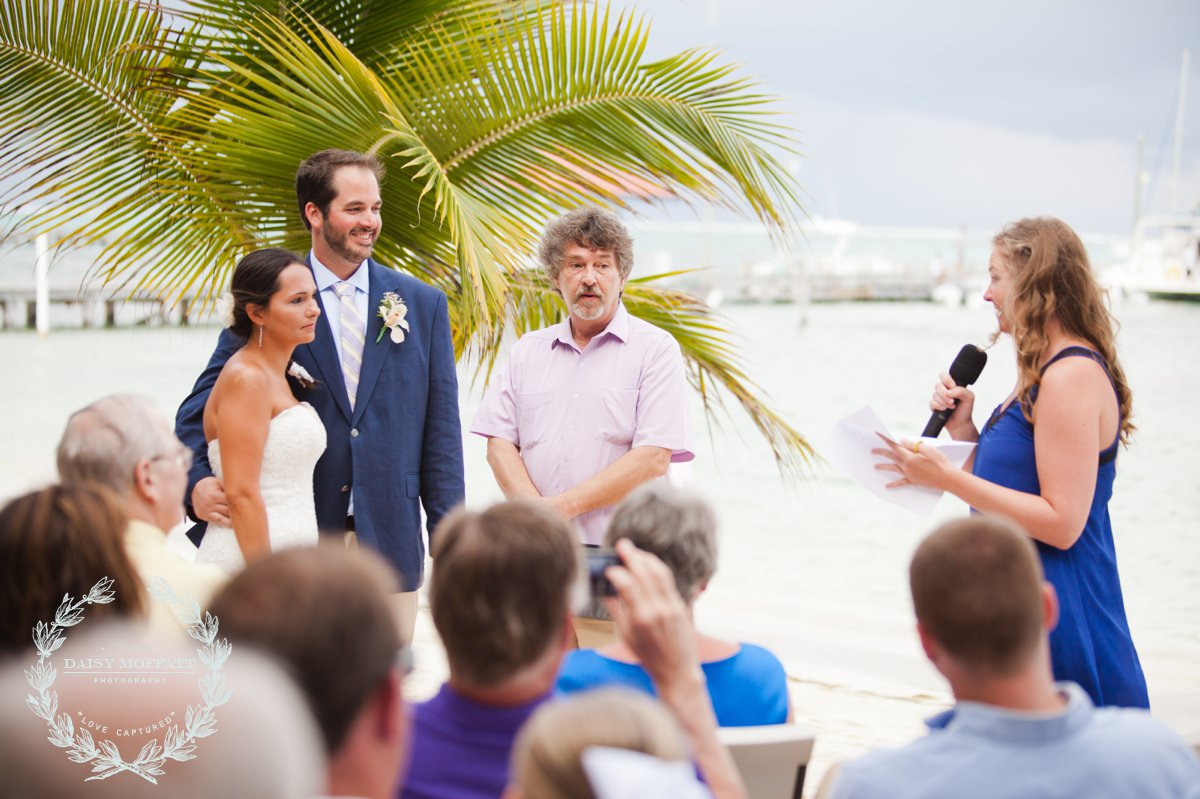 Their wedding day quickly arrived and the day was stunning! The sandy turquoise shoreline was meticulously prepared and their ceremony began as the sun set. The old belief that rain on a wedding day brings good luck means that Joel and Patterson will have the very best of luck! In true tropic fashion a rogue rainstorm snuck into the ceremony (seriously I was amazed at how fast it popped up!). As they stood at the altar Patterson simply looked around, threw her head back in laughter (see below) and they carried on–fully enjoying each moment. My heart swelled as I watched them literally and figuratively weather this little speed bump with such grace and joy. Everyone could see it was the happiest day for both and no one was too concerned about a little summer shower.