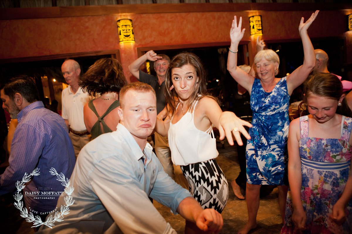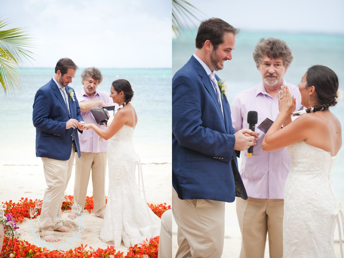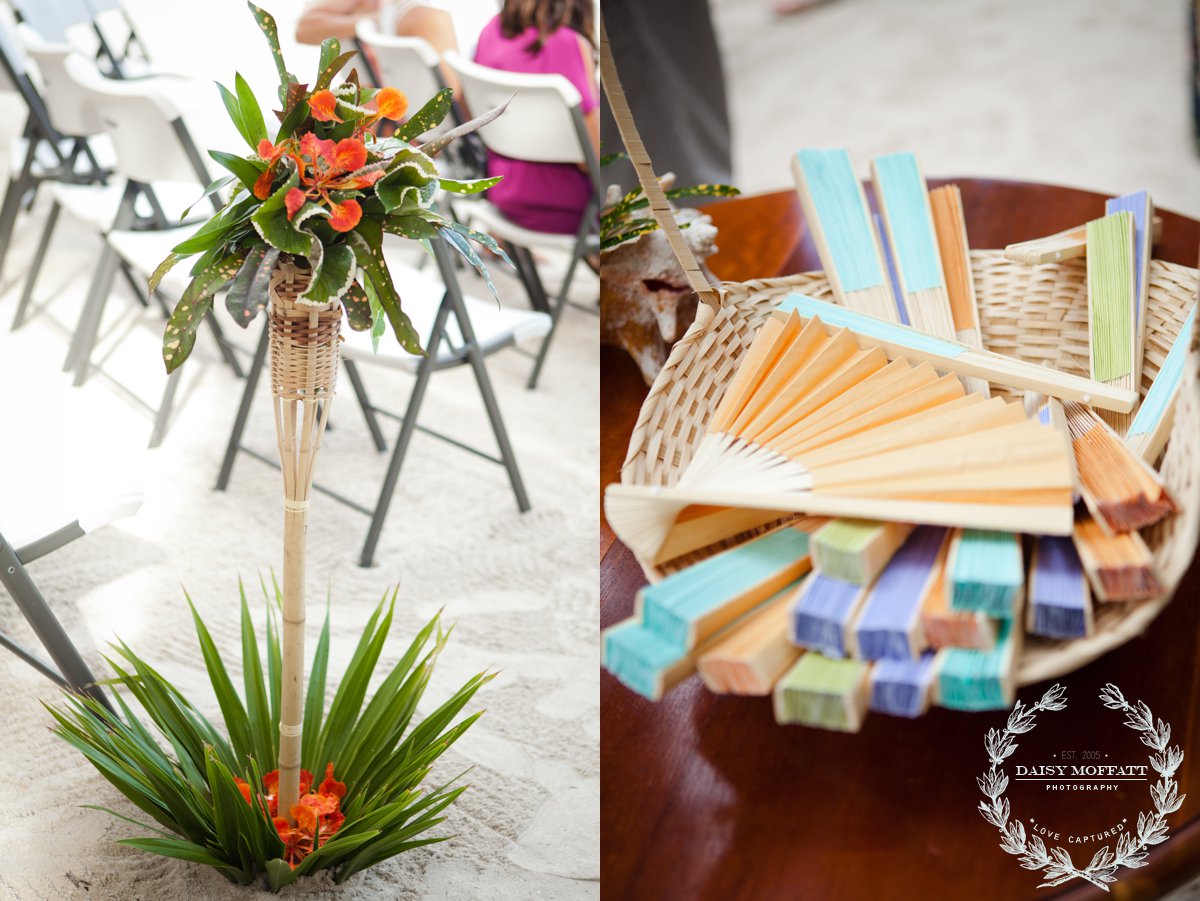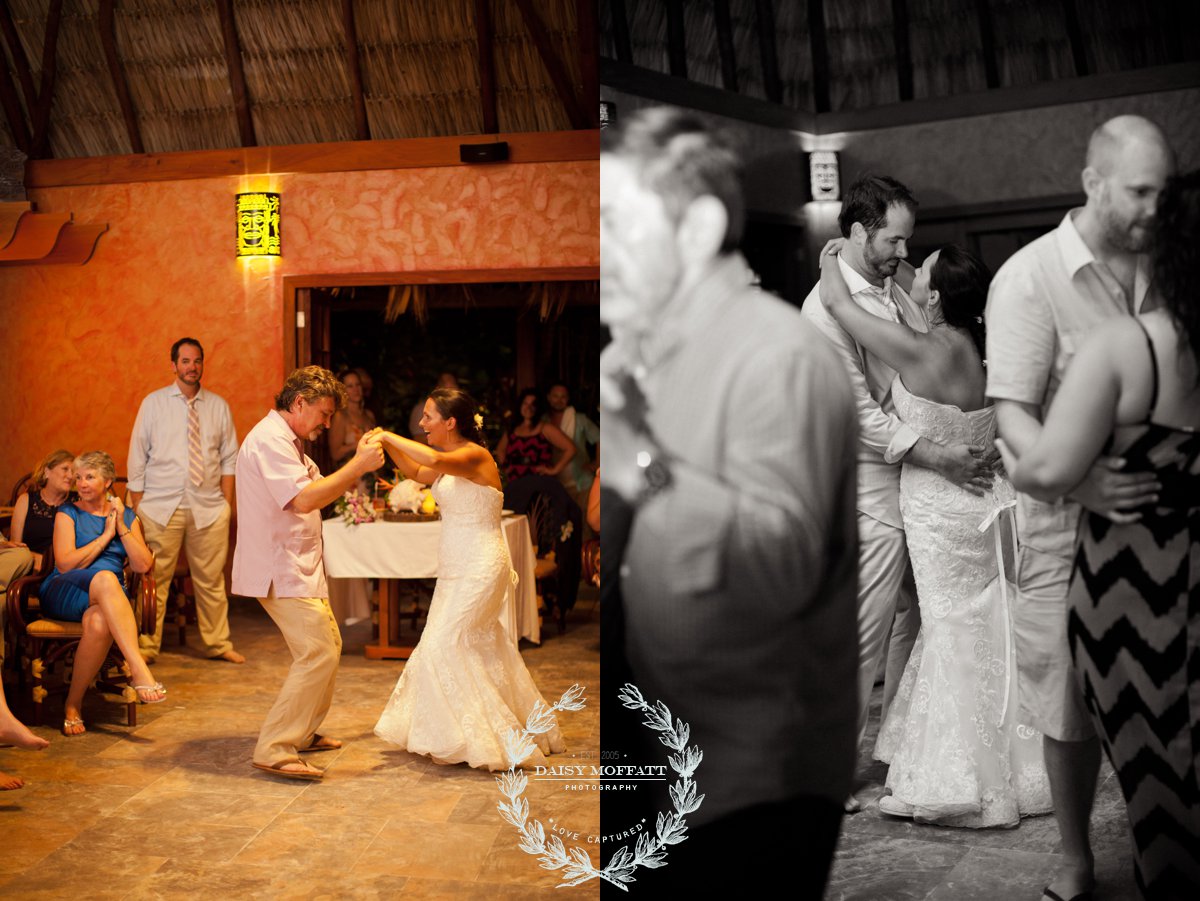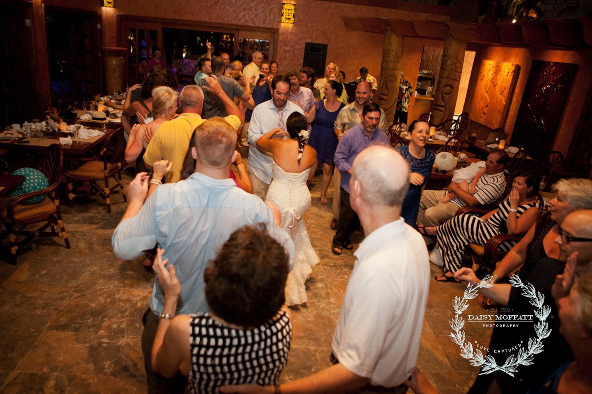 Their wedding day quickly arrived and the day was stunning! The sandy turquoise shoreline was meticulously prepared and their ceremony began as the sun set. The old belief that rain on a wedding day brings good luck means that Joel and Patterson will have the very best of luck! In true tropic fashion a rogue rainstorm snuck into the ceremony (seriously I was amazed at how fast it popped up!). As they stood at the altar Patterson simply looked around, threw her head back in laughter (see below) and they carried on–fully enjoying each moment. My heart swelled as I watched them literally and figuratively weather this little speed bump with such grace and joy. Everyone could see it was the happiest day for both and no one was too concerned about a little summer shower.
