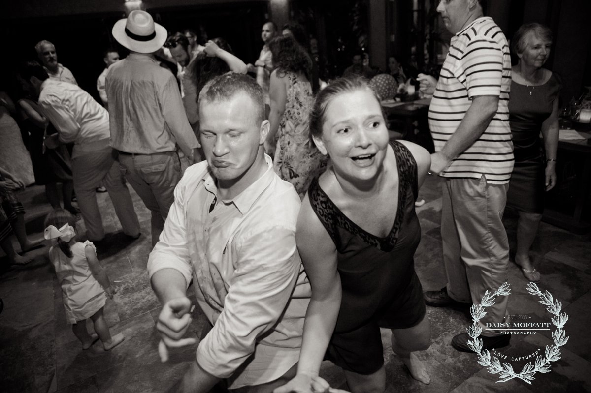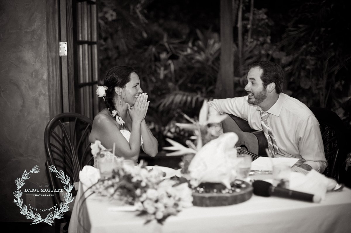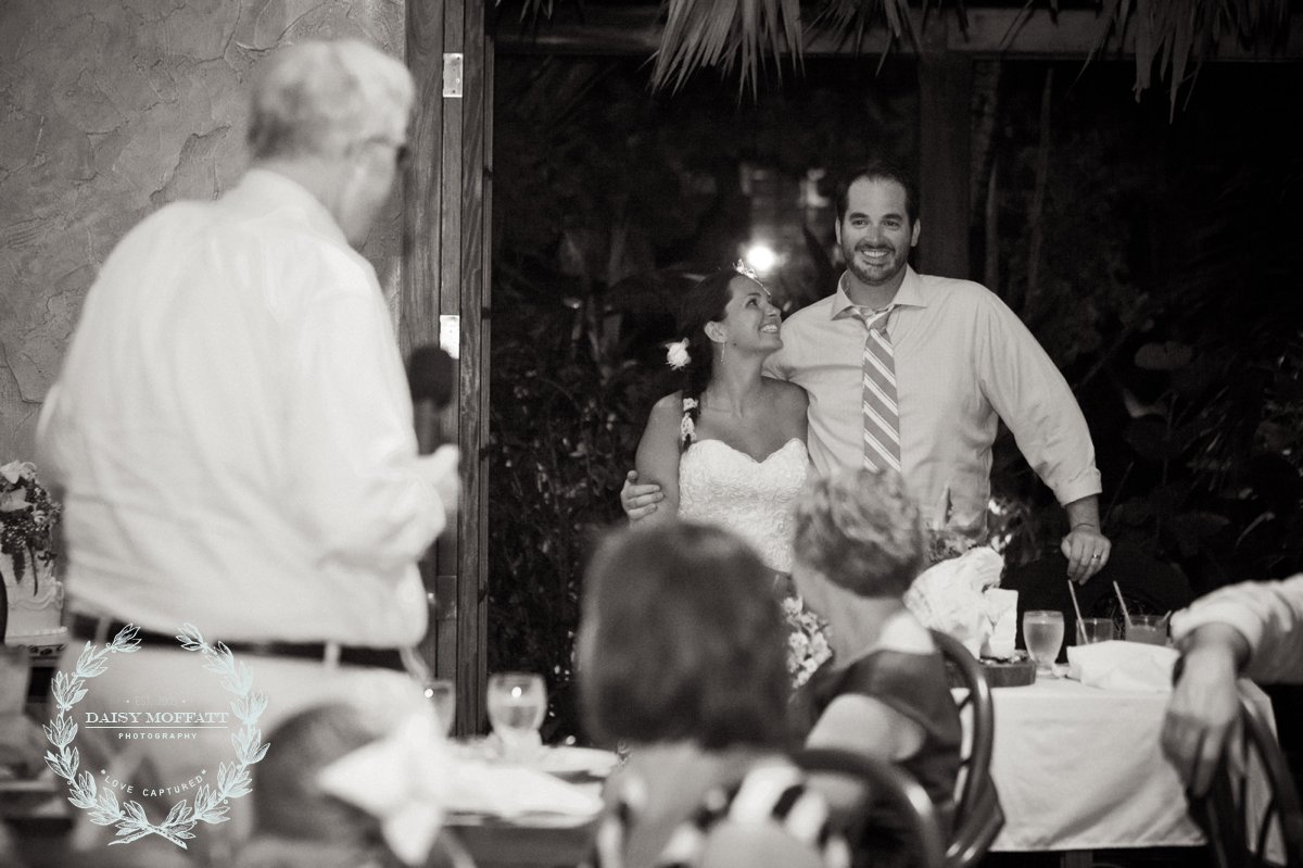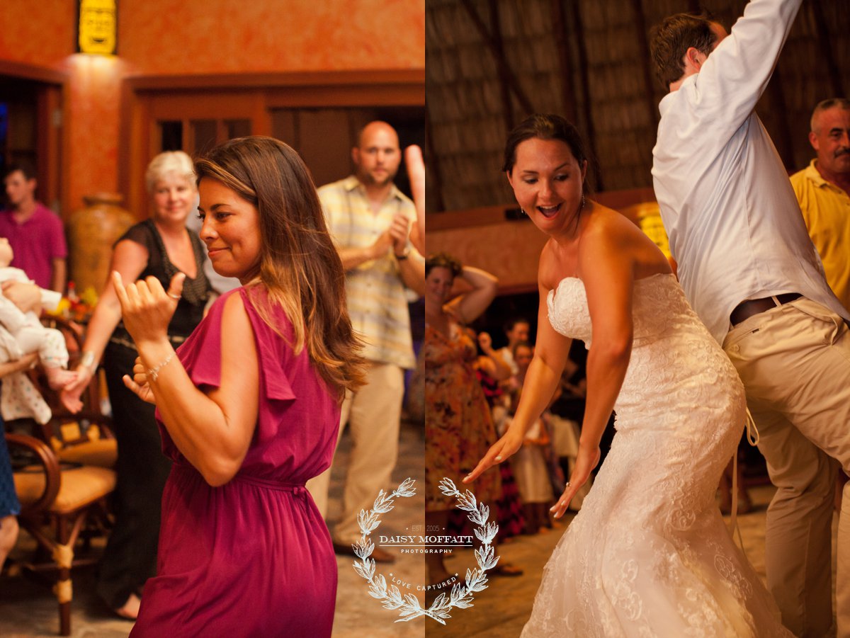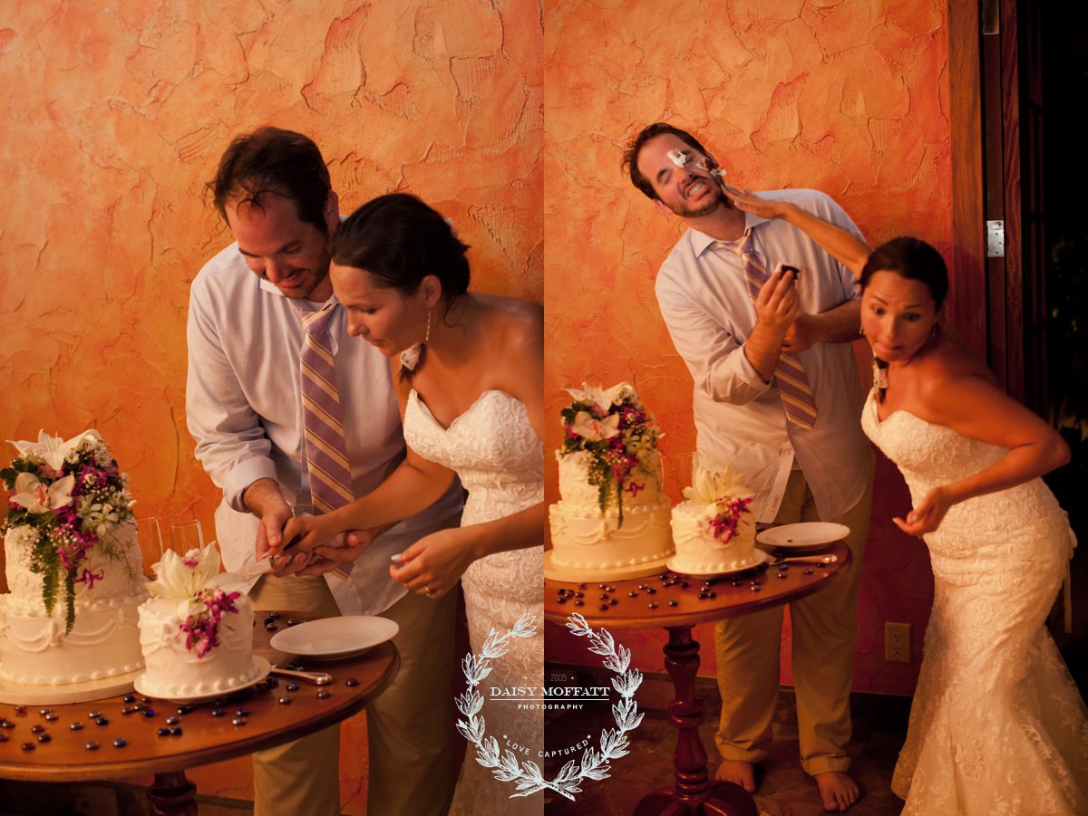 Their wedding day quickly arrived and the day was stunning! The sandy turquoise shoreline was meticulously prepared and their ceremony began as the sun set. The old belief that rain on a wedding day brings good luck means that Joel and Patterson will have the very best of luck! In true tropic fashion a rogue rainstorm snuck into the ceremony (seriously I was amazed at how fast it popped up!). As they stood at the altar Patterson simply looked around, threw her head back in laughter (see below) and they carried on–fully enjoying each moment. My heart swelled as I watched them literally and figuratively weather this little speed bump with such grace and joy. Everyone could see it was the happiest day for both and no one was too concerned about a little summer shower.