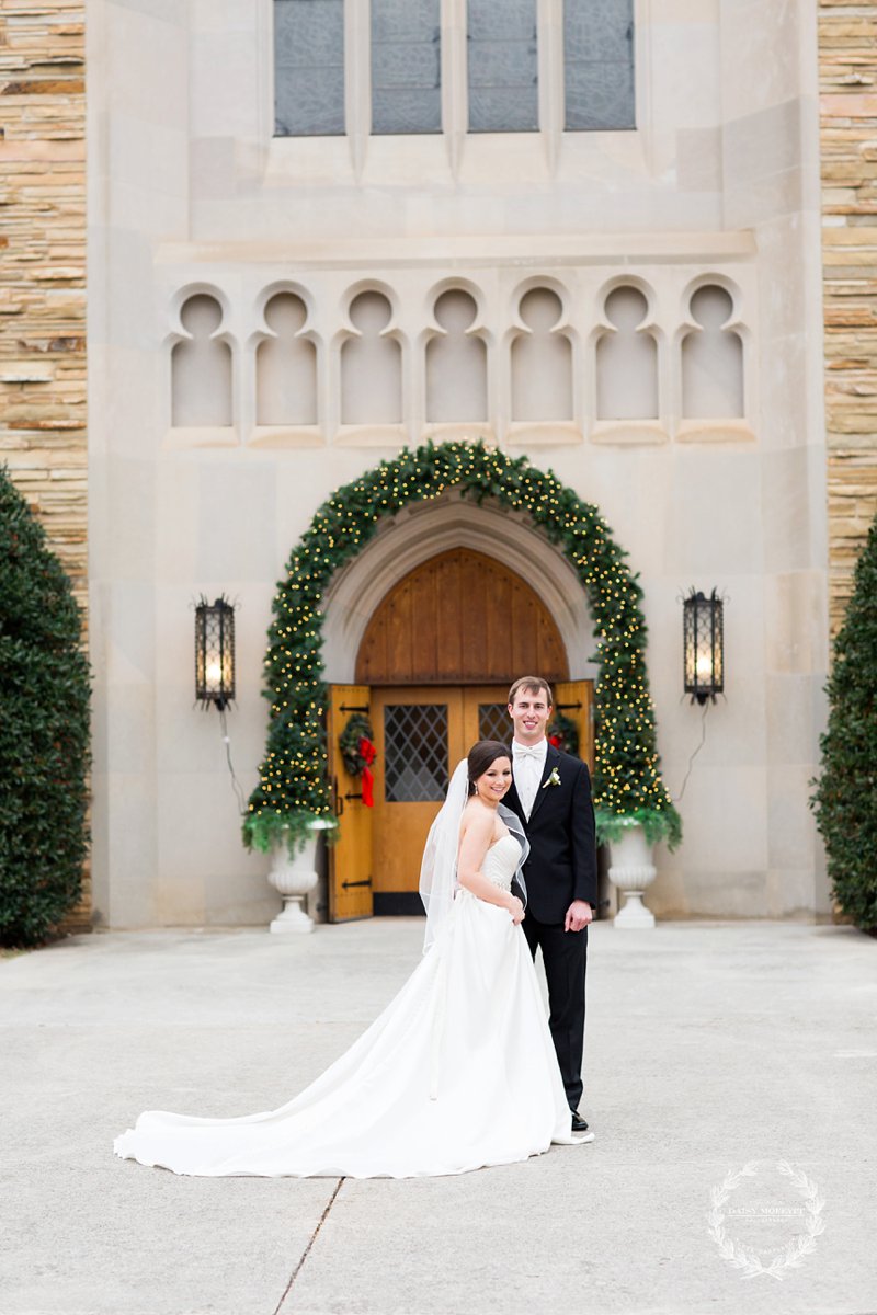 She peeked around the corner to be sure Travis’s back was turned then gingerly stepped into the long stone aisle. Deep breath. She waited and after a few moments Travis slowly pivoted, finally spotting his bride outlined in the doorway. The effect was breathtaking and tears quickly gathered in his eyes. Emily moved towards him excitedly, ready to finally begin celebrating their long awaited New Years Eve wedding day together. This was their time, and they were ready.