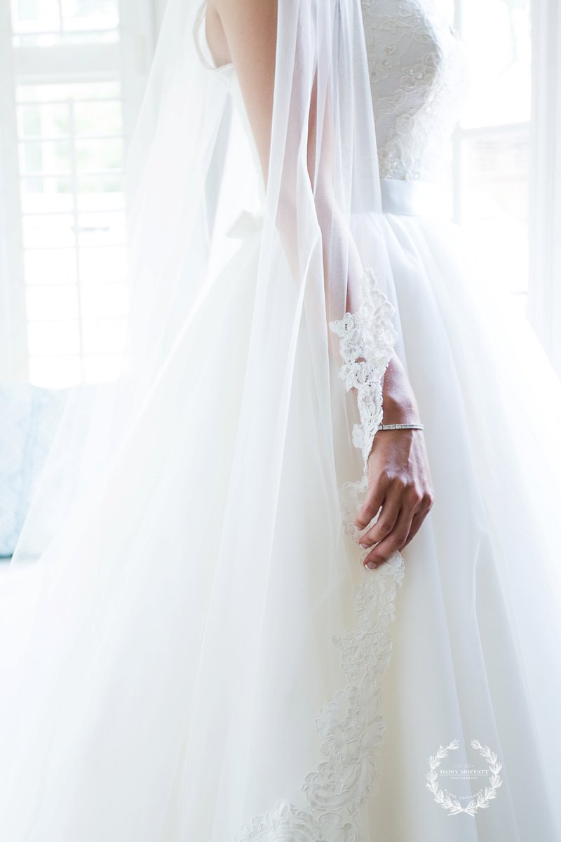 Brittany paused one last time to check her makeup in the mirror propped on the chair, and then moved towards her awaiting custom two piece gown. As her mom laced her delicate corset and placed the final touches Brittany nervously glanced around the room. All eyes were on her. She knew that this moment would come but was a little surprised by just how excited and nervous she was. “How do I look?” she asked her teary-eyed grandmother. She was answered by happy laughter and cheers of support. Stephanie and I gave her cathedral train one last fluff and then snapped a picture of her in all her glory.
